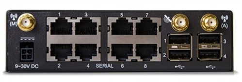 8 serial Cisco Straight pinout, ext power, 2 GbE Ethernet, 4G LTE cellular for APAC region, dual SIM, 2 DIO and 2 output ports.