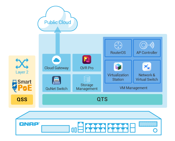 *QTS and QSS can work independently without interfering each other to ensure continuous operation. For example, when restarting the QTS, the QSS PoE power supply will not be interrupted; when rebooting the QSS, the VMs on QTS will keep running.