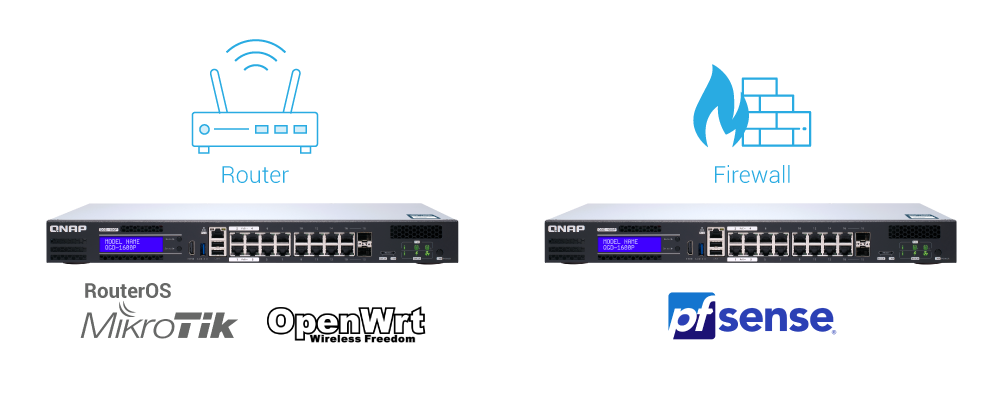 The QGD-1600P can be easily transformed into a security router with a firewall via virtual router and virtual firewall software by installing MikroTik RouterOS and OpenWrt. You can flexibly configure Layer 3 routing functions and create site-to-site VPN tunnels between headquarters and branch offices while securing enterprise network data transmissions. The virtual firewall software pfSense helps enterprises separate or protect local networks and apply multiple security policies.