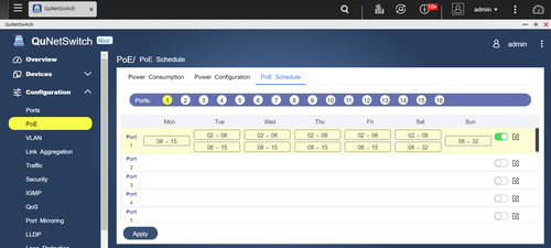 The QGD-1600P supports intelligent PoE management functions, including scheduling, power supply prioritization, and power enabling and disabling. You can obtain the real-time network connection status and power consumption information of PDs and configure PDs simultaneously to promote an energy-saving PoE network.