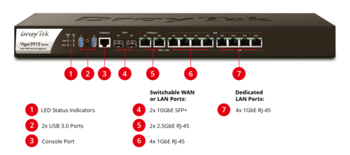 The Vigor 3910 goes beyond 1 Gigabit throughput per port, with both 2.5GbE RJ-45 (copper) ports and 10GbE SFP+ ports.