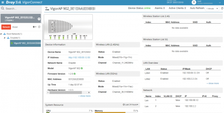 The Dashboard view for VigorConnect gives an instant overview of each separate Network and DrayTek devices connected to it. Select an AP or switch to Drill down into details for that device and see details of its current usage and configuration collected into one place.