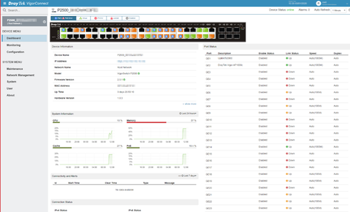 Overview the status and usage of all VigorAPs and VigorSwitches in your network from VigorConnect's Dashboard view.