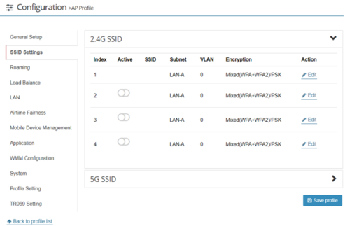 Each AP Profile can set SSIDs, wireless security, VLAN tags and with more advanced features, such as Airtime Fairness and Mobile Device Management