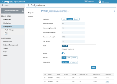 VigorConnect is a free TR-069 based management system to manage up to 100 DrayTek wireless access point and Ethernet switches on the local network.