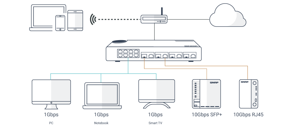 The QSW-M408-4C is equipped with four 10GbE SFP+/ RJ45 combo ports and eight Gigabit ports. Compatible with 10GbE and NBASE-T technologies to support five speeds (10G / 5G / 2.5G / 1G / 100M), the QSW-M408-4C offers higher transmission speeds when used with existing cables.