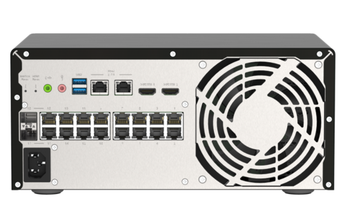 With sixteen 30-watt Gigabit PoE ports, two 2.5GbE host management ports, Intel® Celeron® J4125 quad-core 2.0 GHz processor, and four 3.5-inch SATA drive bays, the QGD-3014-16PT supports QVR Pro, HBS 3 and QuWAN SD-WAN to integrate surveillance deployment, video storage computing, and multi-site remote management to offer SMBs innovative intelligent IP surveillance infrastructure and remote backup solutions.