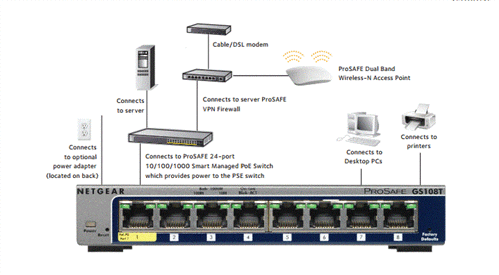 The GS108T provides cost-efficient solutions that enable SMB customers to better manage their network. Included are performance monitoring, port configuration, VLAN for traffic control, link aggregation for increased bandwidth, IGMP snooping for facilitating multicast applications, and Class of Service (CoS) for traffic prioritization.