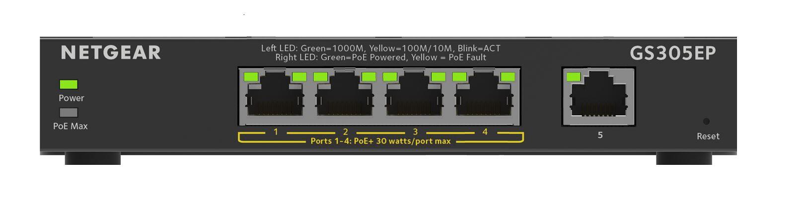NETGEAR GS305EP-100AUS 5-Port Gigabit PoE Smart Switch, 802.3at/af PoE, 4 PoE Outputs, 63W
