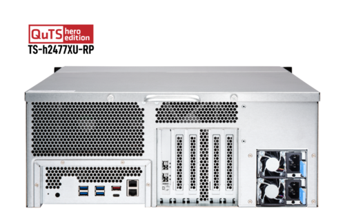 The TS-h2477XU-RP provides two 10GbE SFP+ SmartNIC ports (with an NVIDIA® Mellanox ConnectX-4 Lx SmartNIC controller) that support iSCSI Extensions for RDMA (iSER) to increase data transfer performance and offload CPU workloads between a NAS and ESXi server. With Port Trunking for up to 20Gb/s bandwidth and failover support, the TS-h2477XU-RP satisfies demanding applications including virtualization, massive file transfer, high-speed backup/restoration, and multimedia transmission. The TS-h2477XU-RP is also ideally matched with QNAP’s managed and unmanaged 10GbE switches to form high-speed, secure and scalable network environments without going over budget.