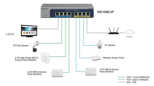 The ideal companions to the MS108EUP are the NETGEAR WAX630 and WAX610 WiFi 6 Access Points that feature a 2.5G Ethernet port.