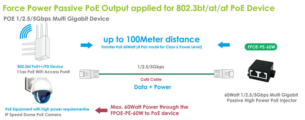 The FPOE-PE-60W Force Power Multi Gigabit PoE++ Injector brings a great deal of convenience benefits to any environments. With latest Force High Power Hardware design through 4Pair UTP Ethernet Cable to delivery both data and power to PD device. It provides 802.3bt Type3 Class6 / 60Watt and Class5 / 45Watt power level for PD device, such as the “PoE IP Speed Dome PTZ CAM ” and “the latest WiFi 6 generation 802.11ax WiFi AP provide a stable high power PoE powered solution. The plug-and-play connection provides a best solution for where power outlets are not readily available and provides a cost-effective solution for high-speed security surveillance (CCTV System) and network planning.