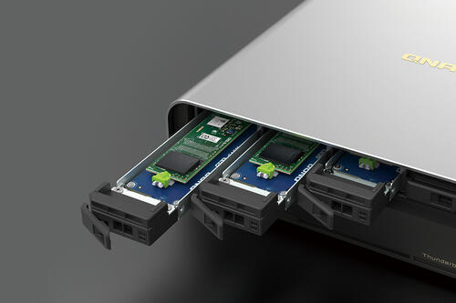 As a frontline video production team, there is the risk of project interruptions due to unexpected SSD failures in storage devices. The innovative TBS-h574TX makes M.2 SSDs become hot-swappable for easier drive replacement. Along with supporting automatic RAID replacement with spares (supported from QTS 5.1 / QuTS hero h5.1), if potential drive errors are detected, the system automatically moves data from the affected drive in a RAID group to a spare, before the data on the affected drive is completely corrupted. This reduces system downtime and data loss risks as it avoids RAID rebuilding.