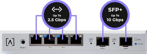 Route10 also provides two SFP+ ports for high-capacity fiber or copper connections of 1 Gbps, 2.5 Gbps, 5 Gbps, or 10Gbps.