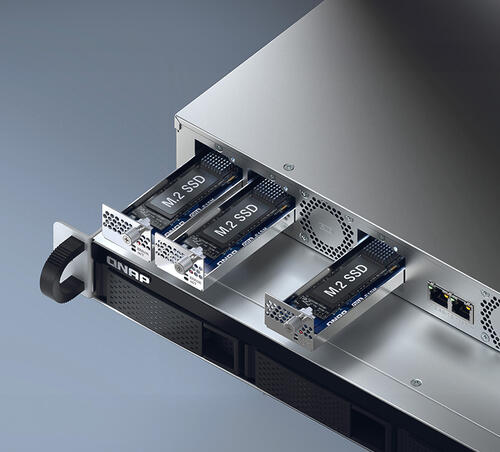 The TS-h765eU comes with three E1.S / M.2 PCIe NVMe slots that offer unparalleled NAS flexibility for boosting performance. To reach its full potential, it is recommended to upgrade the TS-h765eU to support high-speed 10GbE networking and pair it with M.2 SSDs.
