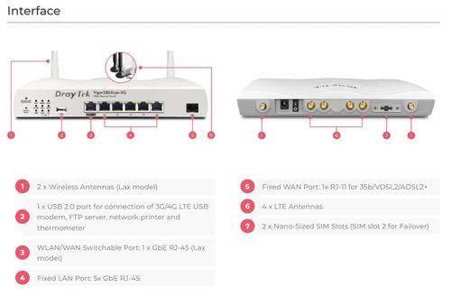 - Multi-WAN with 1 x VDSL2 35b modem, 1 x configurable GbE WAN/LAN port, 1 x USB port, 2 x 5G/4G LTE nano SIM slots, and 2 x Wi-Fi WANs for Lax-5G model