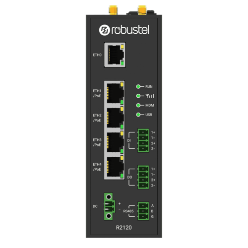 The Robustel R2120 is a compact, ruggedized cellular router with integrated Power over Ethernet (PoE), built to simplify deployment and power management in distributed IoT environments.